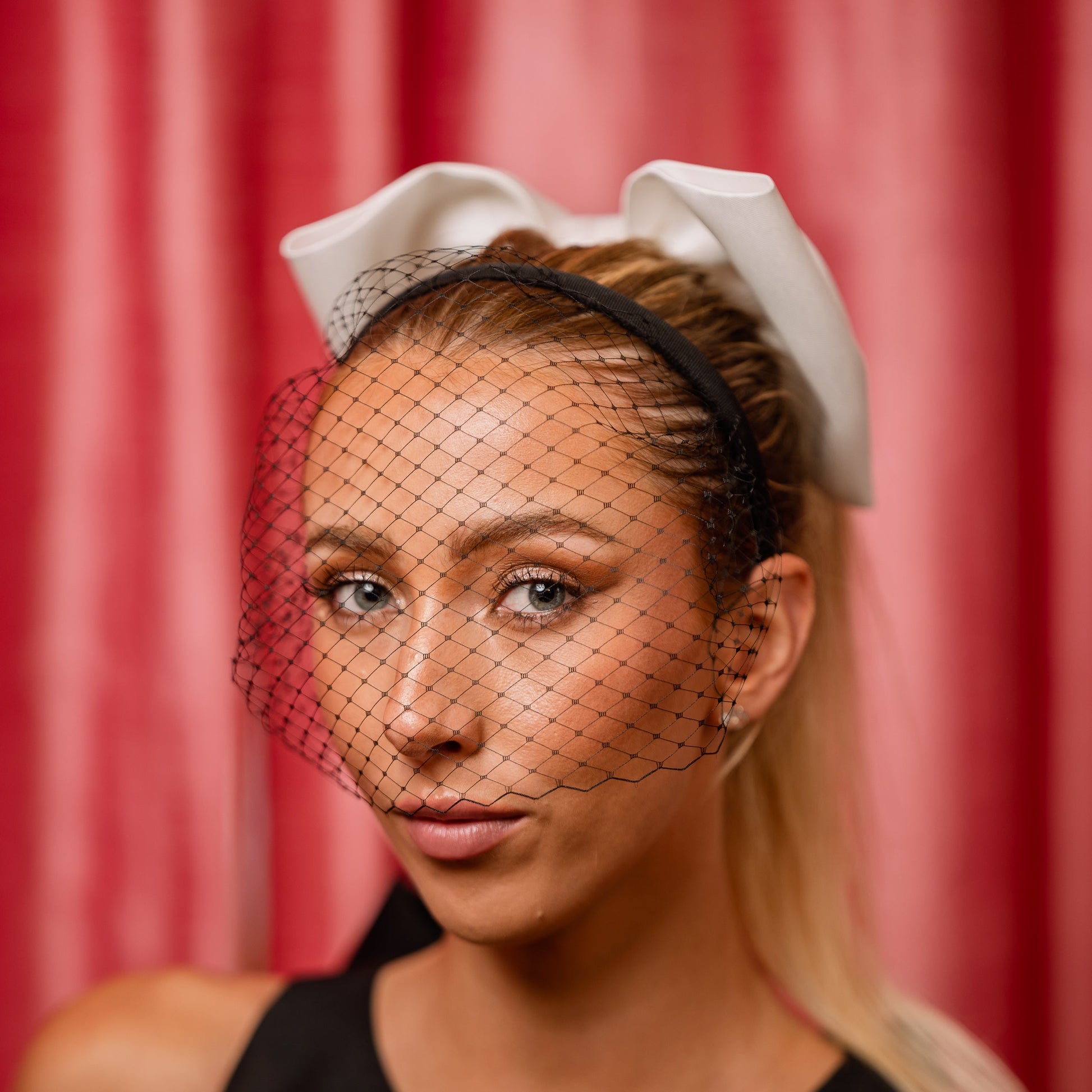 Pictured here in the 3/4 veil size. There is a matching Mikado black or white bow available to order also. Veiled headbands can be worn on their own or layered under a Velvet Hammer Embellished Headband