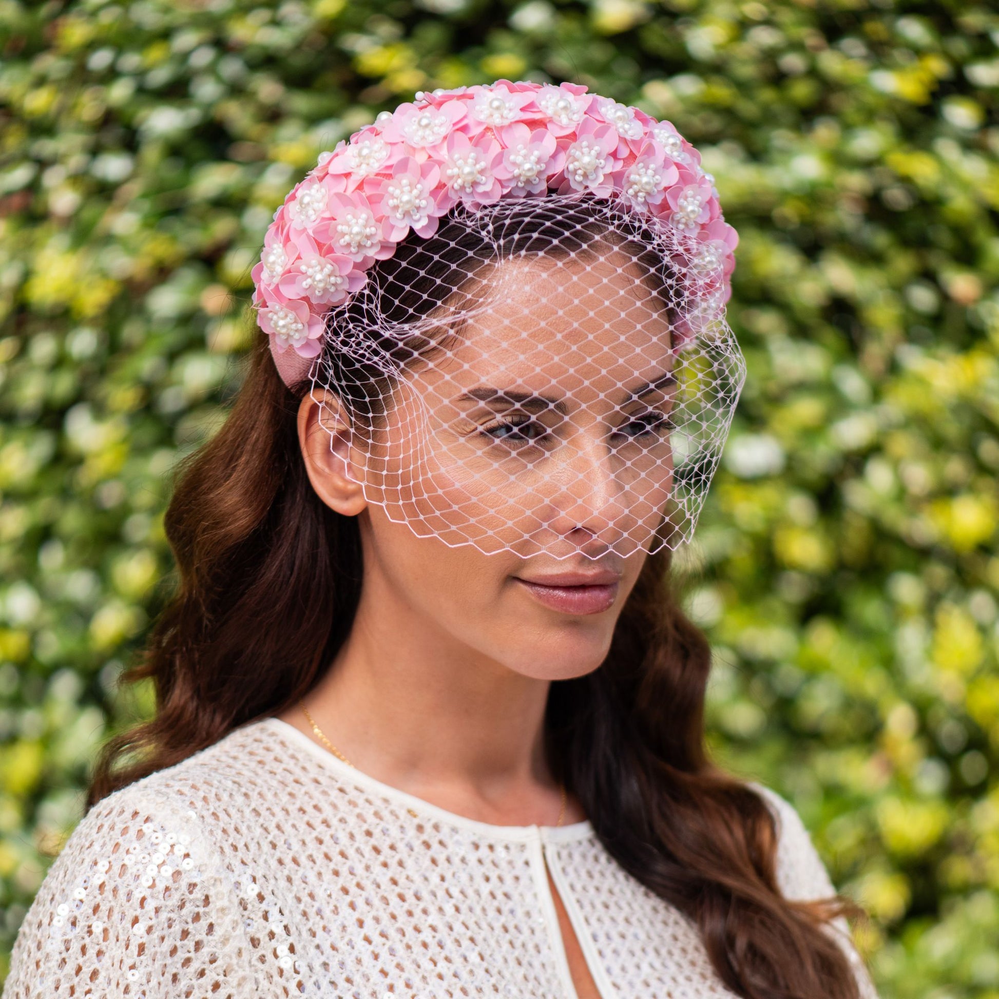 Inspired by the romance of spring blossoms, this headband is a nod to 1960s mod style with a modern feminine twist. The soft pink sinamay base is adorned with handcrafted hydrangea blooms, each accented by tiny pearl buds for a luminous touch. A whisper-fine veil of pink French netting adds drama and allure, while the piece is designed for both comfort and elegance. The result is a statement headband that balances playful charm with timeless sophistication.