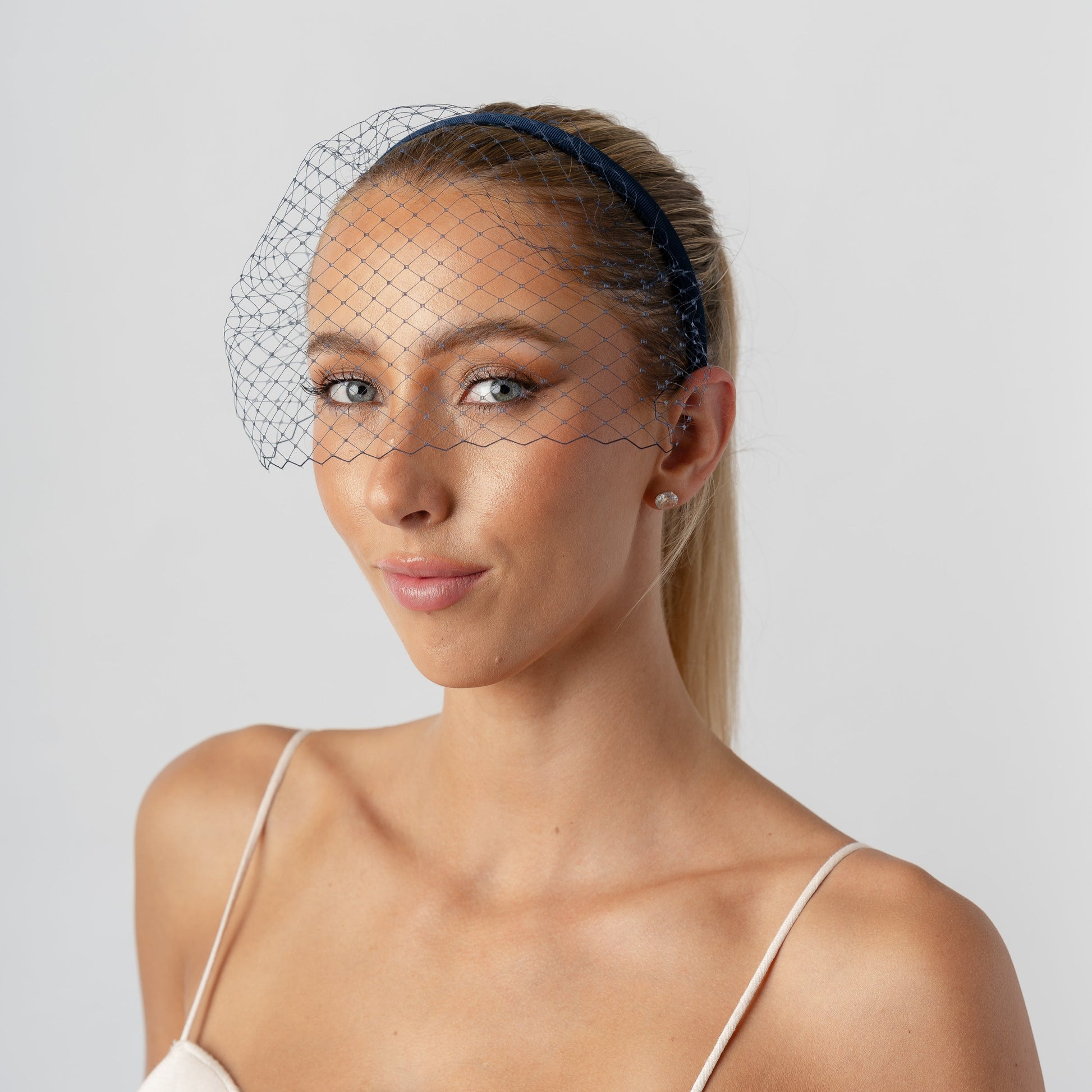 Pictured here in the 1/2 veil size. There is a matching Mikado Navy bow available to order also.