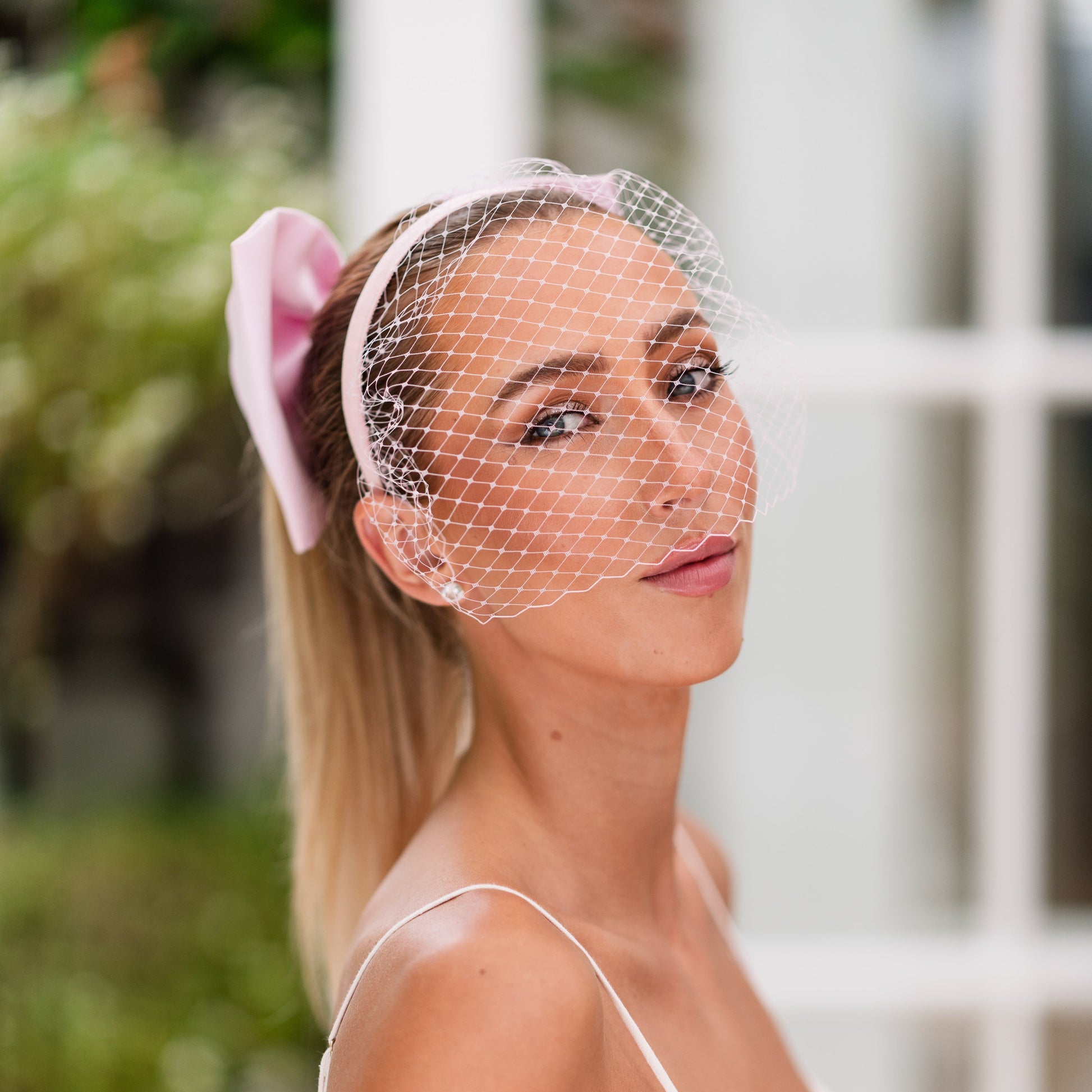 Pictured here in the 3/4 veil size and styled with the Mikado Bow in Pink (bow sold separately, available to order). Veiled headbands can be worn on their own or layered under a Velvet Hammer Embellished Headband