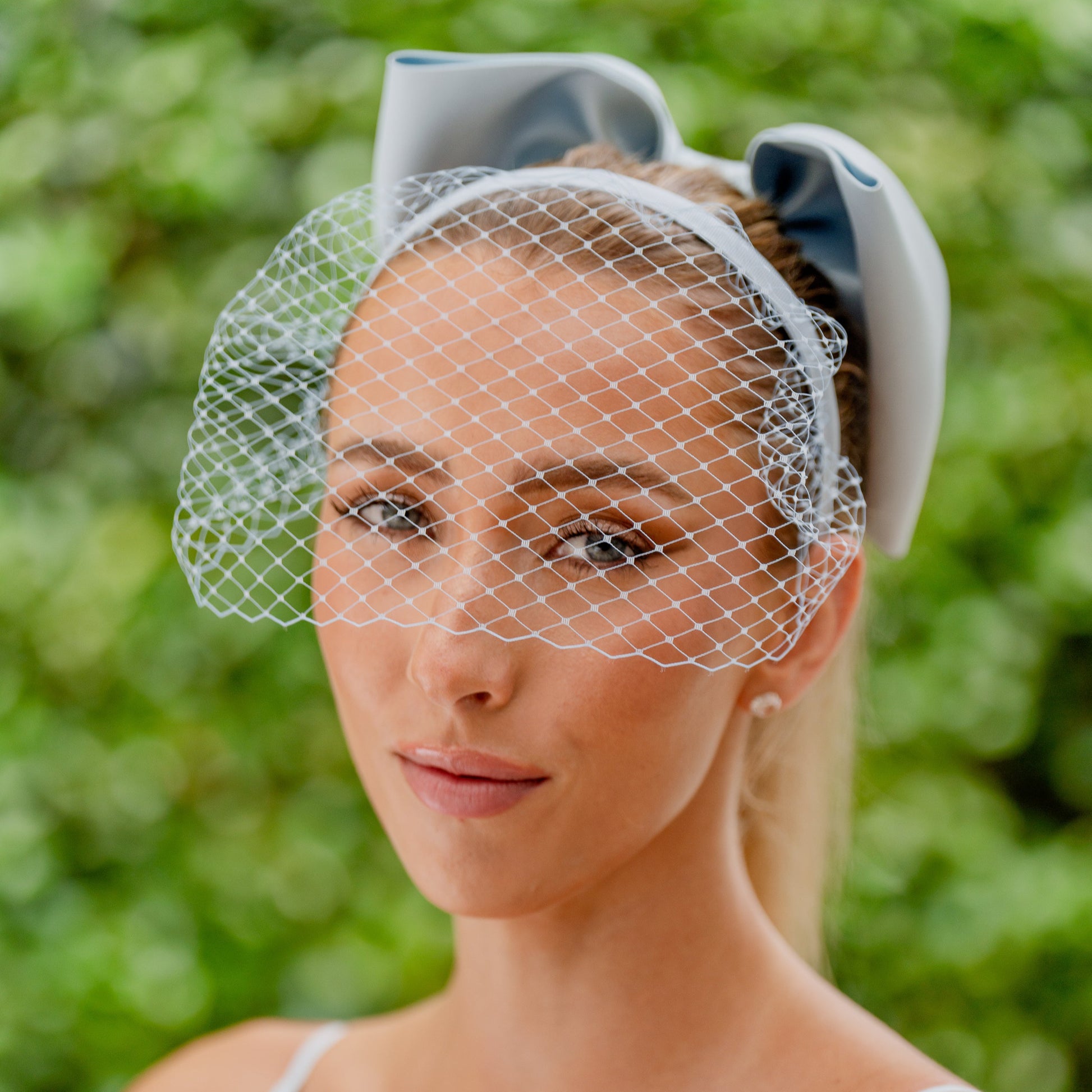 Pictured here in the 1/2 veil size and styled with the Mikado Bow in Powder Blue (bow sold separately, available to order).